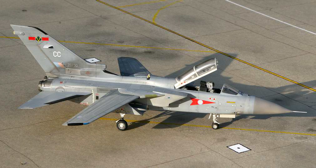 Certains panneaux sont ensuite traités avec des variations des teintes de base. Sur les Tornado, un certains nombre de zones sur la dérive, ou autres parties mobiles sont traités dans une gris plus sombre : il s’agit probablement d’un fini anti-abrasif dont les limites sont elles aussi, réalisées par masquage. Il en est de même pour le cône radar qui, lui, est plus clair.