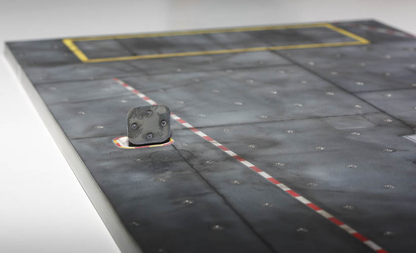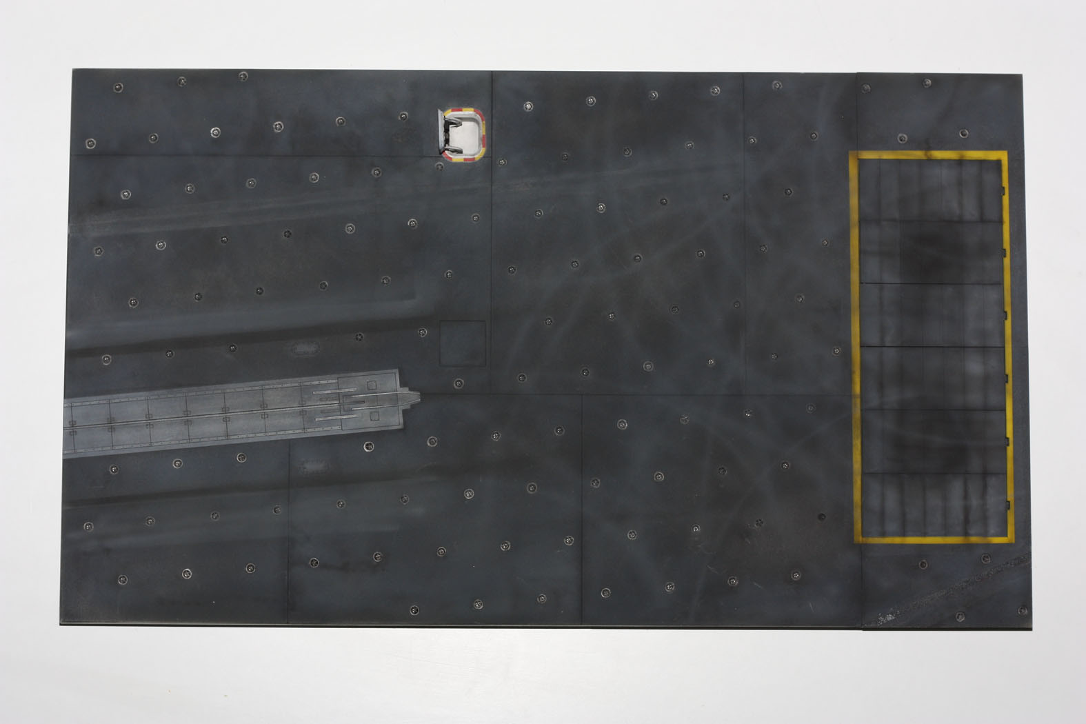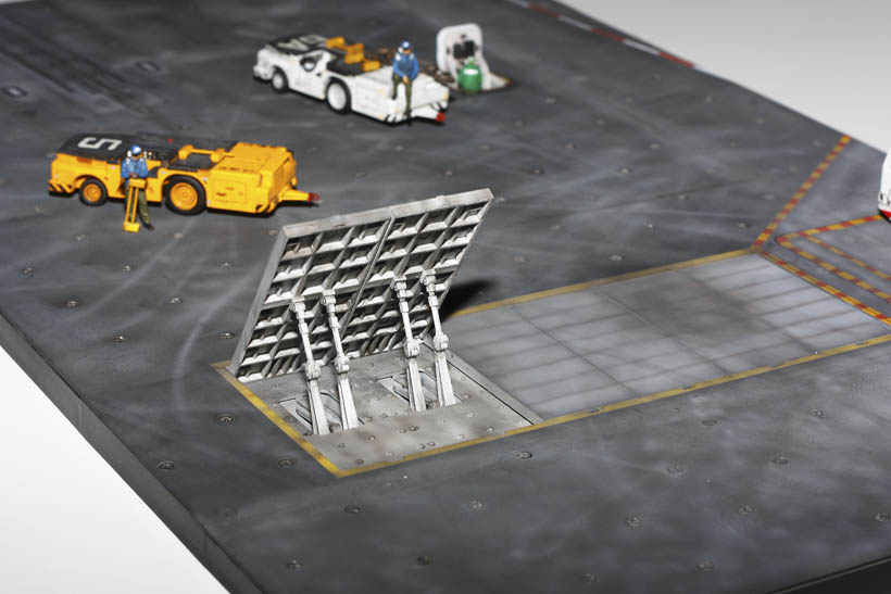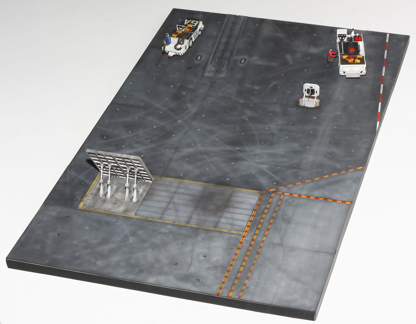 Remarque : En obstruant cette trappe, il semble possible de représenter avec la base Italeri la catapulte principale située sur la piste d'atterrissage du porte avion (catapulte n°3).