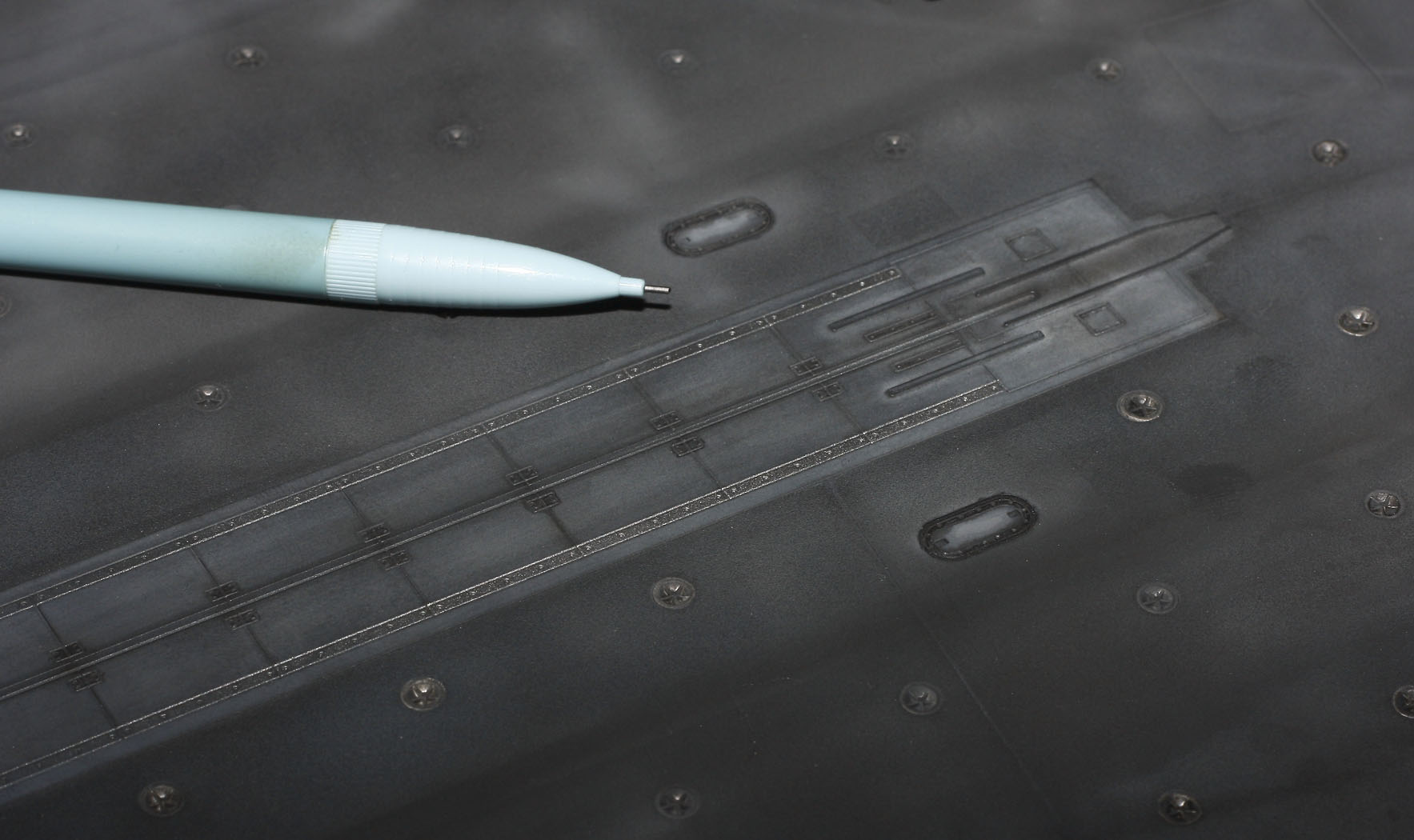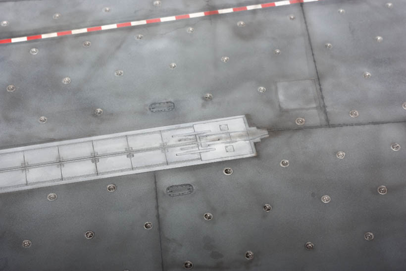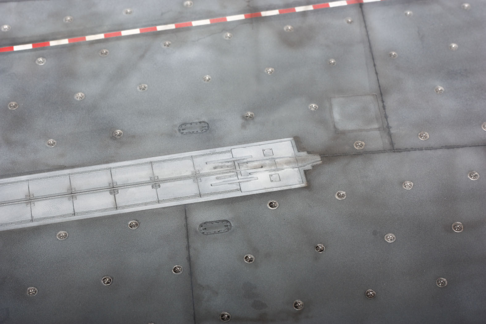 - Enfin j'ai repiqué avec des teintes alu diverses ou simplement au crayon à papier des plaques métalliques du rail de la catapulte.