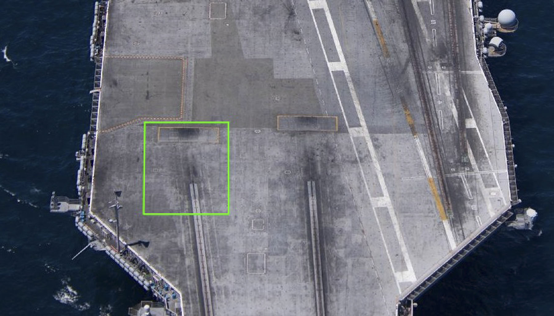 Une telle trappe est forcément située plus loin sur le pont, au delà de l'aéronef prêt à être lancé :