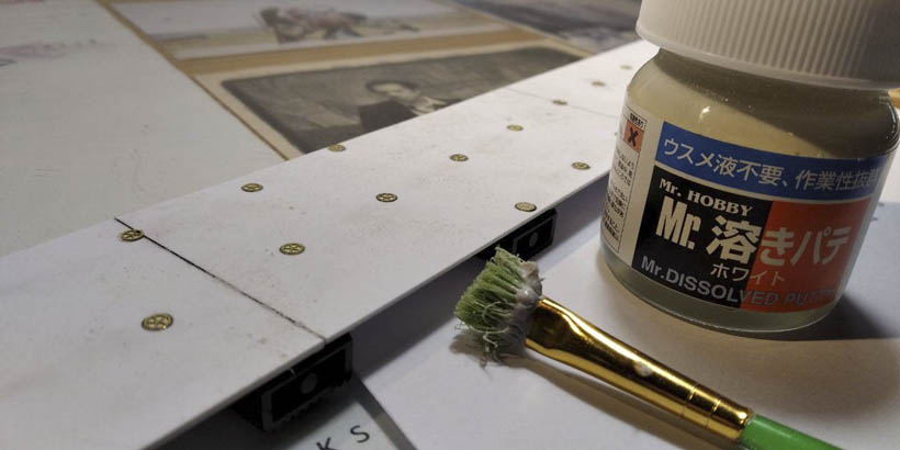 L'emplacement des points d'encrage sur ces rajouts est marqué au crayon, en suivant l'alignement d'Italeri.